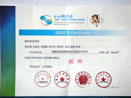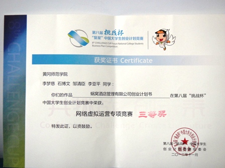 公司李梦慈、朱守兰等同学的《蜗窝酒店管理有限公司创业计划书》荣获银奖。在“挑战杯”中国老员工创业计划竞赛网络虚拟运营专项竞赛中,李梦慈、石博文、邹清臣、李亚平四位同学组成的团队荣获三等奖。这是公司自参加“挑战杯”赛事以来,继今年6月首次捧得湖北省“优胜杯”,获得省级金奖后取得的又一个新突破。