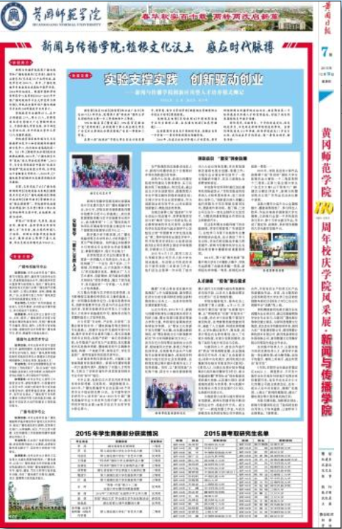 12月10日,《黄冈日报》专版报道威廉希尔williamhill新闻与传播公司实验支撑实践,创新驱动创业。 报道图文并茂,从实验教学 ﹃催生﹄实践人才 、 创新意识“激发”创业热潮、人才规格“接轨”地方需求三个层面全面报道该院以“形象好、气质佳、能说会写、强制作、善经营的应用型传播人才”为目标,以实验教学支撑专业实践,以创新发展驱动创业就业,走出了独具特色的应用型人才培养道路。