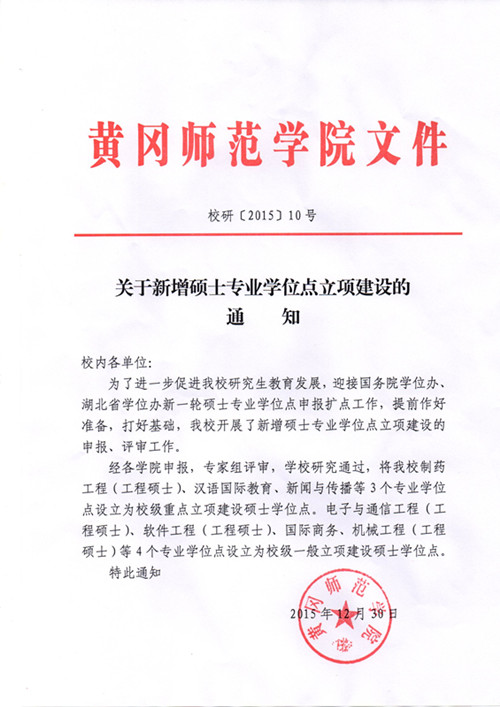 12月30日,根据威廉希尔文件校研文件〔2015〕10号《关于新增硕士专业学位点立项建设的通知》,在湖北省新一轮硕士专业学位点申报中,公司积极准备,做好申报的各项工作,威廉希尔williamhill新闻与传播专业学位点被设立为校级重点立项建设硕士学位点。