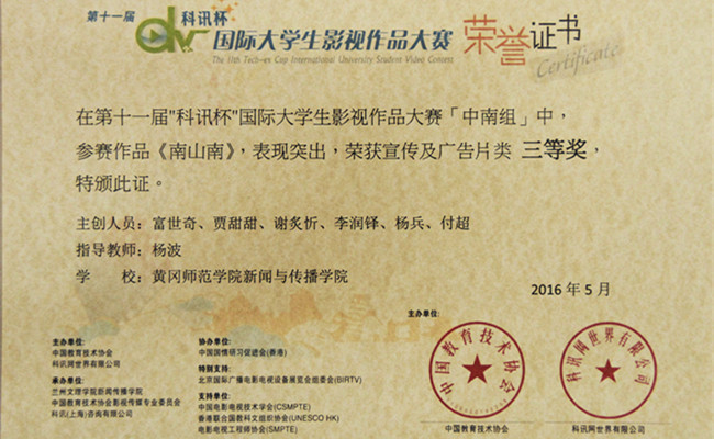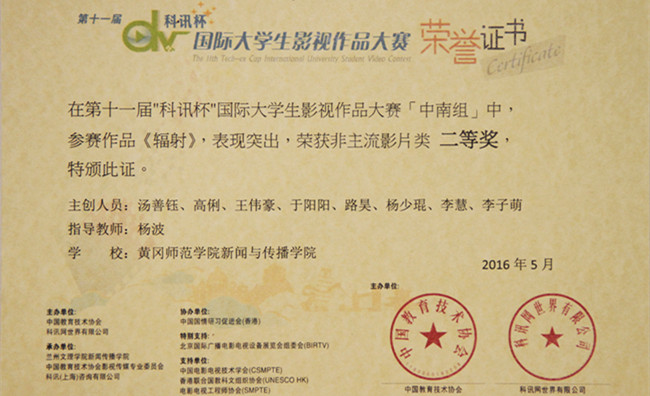 第十一届“科讯杯”国际老员工影视作品大赛颁奖典礼在兰州文理公司落下帷幕,由杨波老师指导,三皮影音工作室选送,汤善钰、路昊、李慧等同学创作的作品——《辐射》荣获“中南组”非主流影片类二等奖;富世奇、贾甜甜、杨兵等同学创作的作品——《南山南》荣获“中南组”宣传及广告片类三等奖。