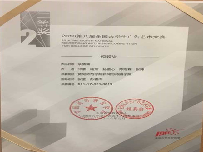 此外,另有三部广告作品获得不同类别的全国优秀奖,分别是杨波老师指导,员工王宜帅、袁潜创作的广告作品《致你的信》和孙熹杰、张莹老师指导,员工汪鸿仪、徐晶晶、陈琪、吕慧、李雪创作的广告作品《一启魔力》获得视频类优秀奖;张莹、孙喜杰老师指导,员工彭枫、张宇强、马飞龙、骆成功、江嘉茜创作的《加乐活饮品营销策划书》获得营销创客类优秀奖。