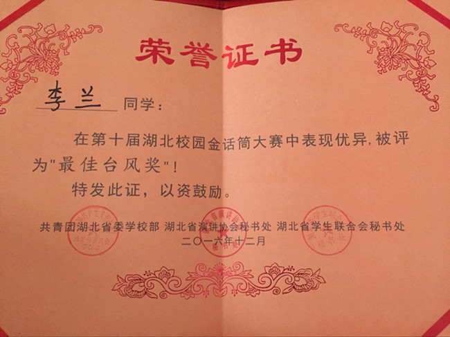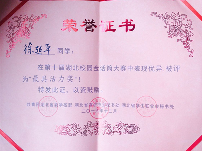 本次大赛邀请全国金话筒奖得主、湖北广播电视台播音指导刘静,全国金话筒奖得主、湖北广播电视台教育频道总监孙汀娟,湖北省演讲协会副会长、湖北广播电视台生活频道副总监谢东升,长江日报编委、长江网总编辑郑萌,中国青年网湖北频道总监潘佳秀子担任评委。大赛分为我是主播、图说我话、自备栏目主持三个环节。来自全省10余所高校共20名选手在决赛舞台上竞技。公司李兰和徐延平同学表现优秀,获得评委老师的好评,最终分获最佳台风奖和最具活力奖。徐延平同学并进入前十名,实现公司学子参与该赛事所获奖项的新突破。