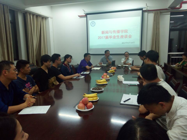 6月14日晚,新闻与传播公司2017届毕业生代表座谈会在1616会议室召开,党总支书记杜建东、经理沈嘉达、副书记黄佑和、副经理李育林、经理助理张新刚和毕业生辅导员柯小军老师出席参加座谈会。