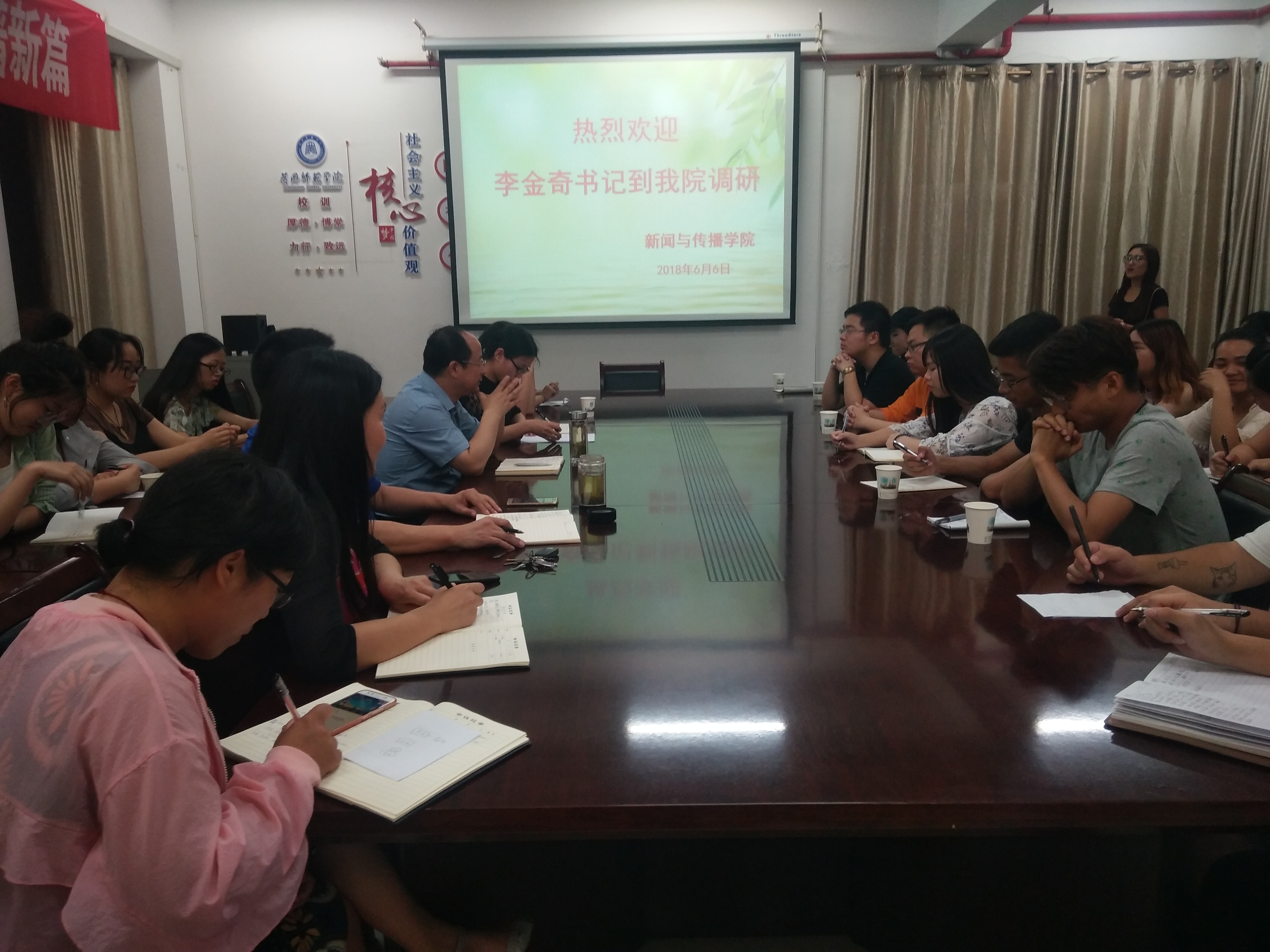 在厚德楼1616会议室,李金奇与广播电视编导专业1504班、柳园2栋613寝室全体员工就专业学习和生活环境等情况展开愉快而热烈的交流。在认真听取了员工的自我介绍后,李金奇详细询问了员工学习、生活、课程安排、教师的精神风貌等方面的情况。在交流发言中,员工充分肯定了新传教师的精神风貌,他们一致认为,老师对员工非常负责,经常主动与员工交流互动,尽职尽责为员工解决生活和学习上的问题。编导1504班班长张子硕同学向李书记汇报班级的学习状况时说,同学们课堂表现积极、考勤情况优良,实践能力强、积极参加校内外各种比赛并取得较好的成绩,班级团结奋进,并获得了2017年度“五四红旗团支部”荣誉。李金奇鼓励大家一定要再接再厉、不骄不躁,求真学问,练真本领,做奋斗者、做实干家。