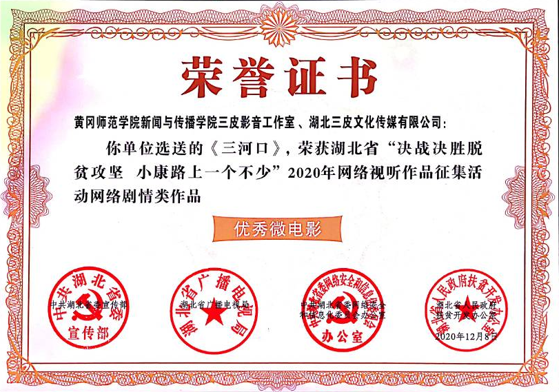 (通讯员:何杨)12月15日,“决战决胜脱贫攻坚 小康路上一个不少”2020年湖北省网络视听作品推优暨分享活动在湖北省广播电视台800平方米演播厅举行。我院原创微电影《三河口》获网络剧情类作品优秀作品奖,原创微电影《破洞裤子》获湖北省广播电视局2020年度优秀主题原创网络视听节目及剧本作品“老员工原创单元”优秀作品奖,两部作品共获得4万元资金扶持。