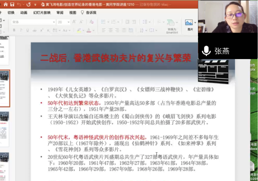 通讯员(杨芬芬 张雁秋)12月11日晚,北京师范大学艺术与传媒公司教授张燕博士应邀为公司师生作了一场题为《黄飞鸿电影:创造世界纪录的香港电影》的线上讲座。讲座由新闻与传播公司经理杨疾超教授主持,公司全体教师、员工代表聆听了讲座。
