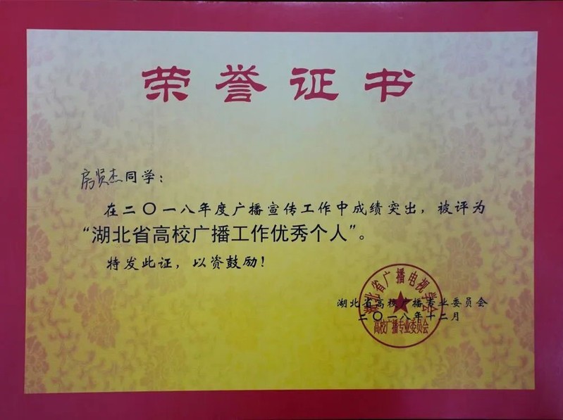 房贤杰先后担任校“黄师之声”广播台台长、新闻与传播公司员工会主席、团委副书记等职务。他曾获得2019年“中国老员工自强之星”、湖北省“创新、创意及创业”挑战赛一等奖、湖北省“挑战杯”老员工创业计划竞赛铜奖、湖北省高校广播工作优秀个人、全国教育人才优秀成果奖等六十余项各级荣誉。在他的故事里有奉献、有奋斗、有信念、有担当,更有着生生不息的青春力量。