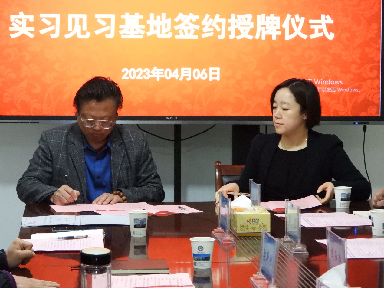 经理杨疾超与威廉希尔williamhill党总支副书记、总经理李淑静签订实习见习基地建设协议书,并向威廉希尔williamhill党总支书记、董事长杨辉,授“威廉希尔新闻与传播公司传媒与艺术实习见习基地”牌额。