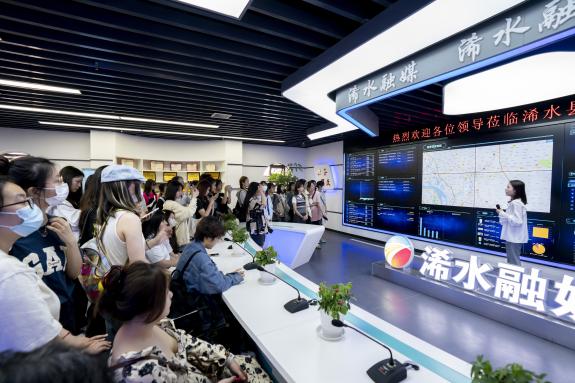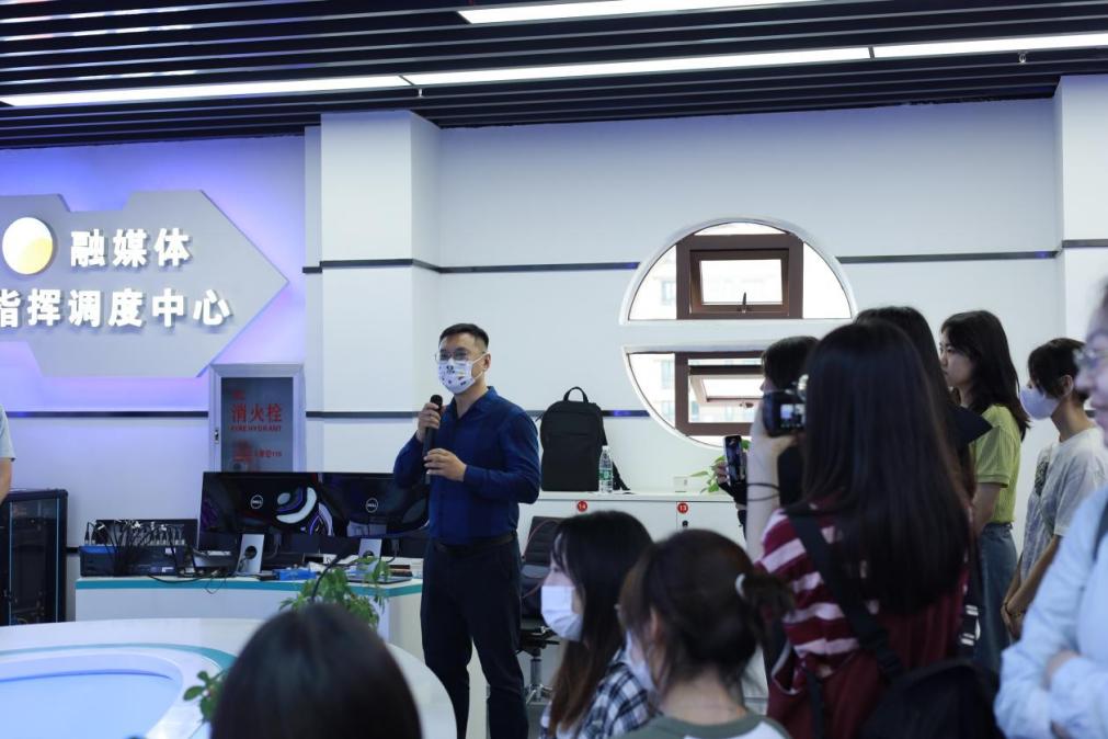 随后,师生们在融媒体中心一楼观看了浠水县媒体融合宣传片《融合创新向未来》。通过宣传片大家进一步了解了浠水县融媒体中心的建设历程。 之后,大家参观了融媒体指挥调度中心。这里是浠水县融媒体中心的“大脑”和“中央厨房”,融媒体中心的所有业务生产都由这里指挥调度。工作人员现场讲解了浠水融媒的各个板块分工,指挥调度大屏显示了全网新闻实时热点追踪、记者采访传输、指挥调度地图、内容生产流程、转码中心等工作概况。同学们仔细聆听观看,不少同学表示是第一次见到功能如此齐全的新媒体设备。