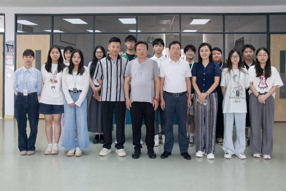 交流会后,杨疾超、王锋与校方负责人、公司实习生合影留念。