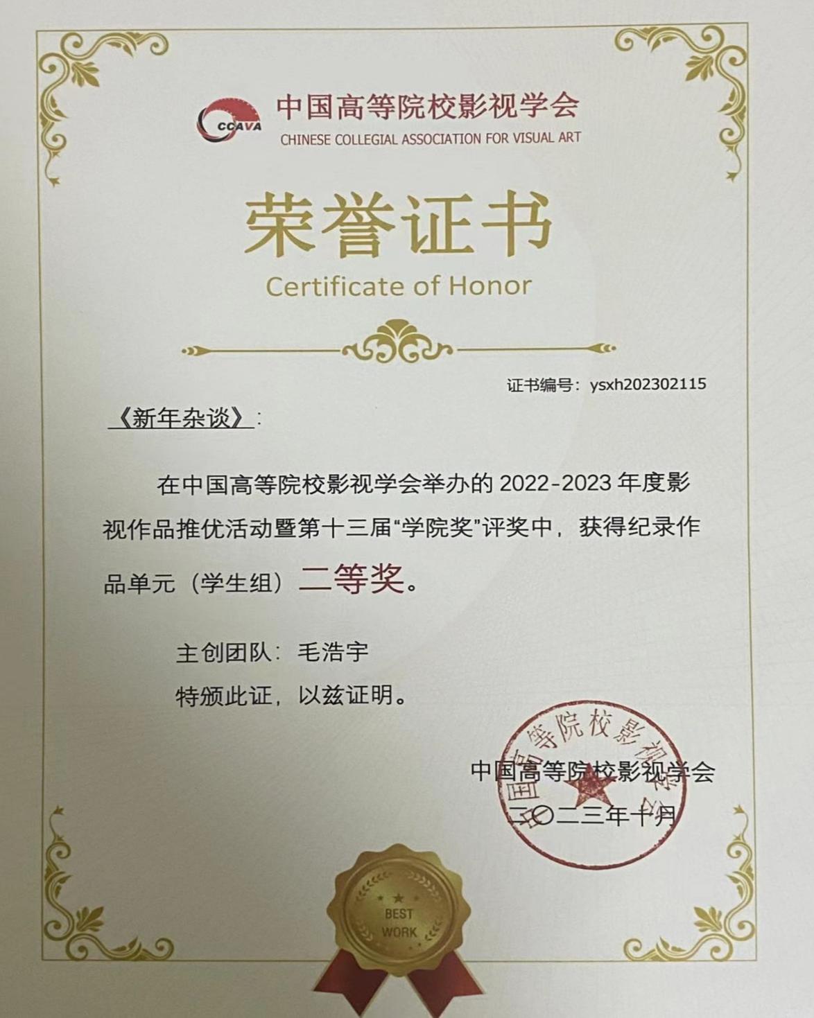 会议期间,1021日晚,在北京电影公司的千人剧场,举办了2022-2023年度学术成果、影视作品推优活动第十六届“学会奖”、第十三届“公司奖”颁奖典礼。由副经理孙喜杰推荐,员工毛浩宇导演的纪录片《新年杂谈》(After going home荣获公司奖纪录片单元(员工组)二等奖。