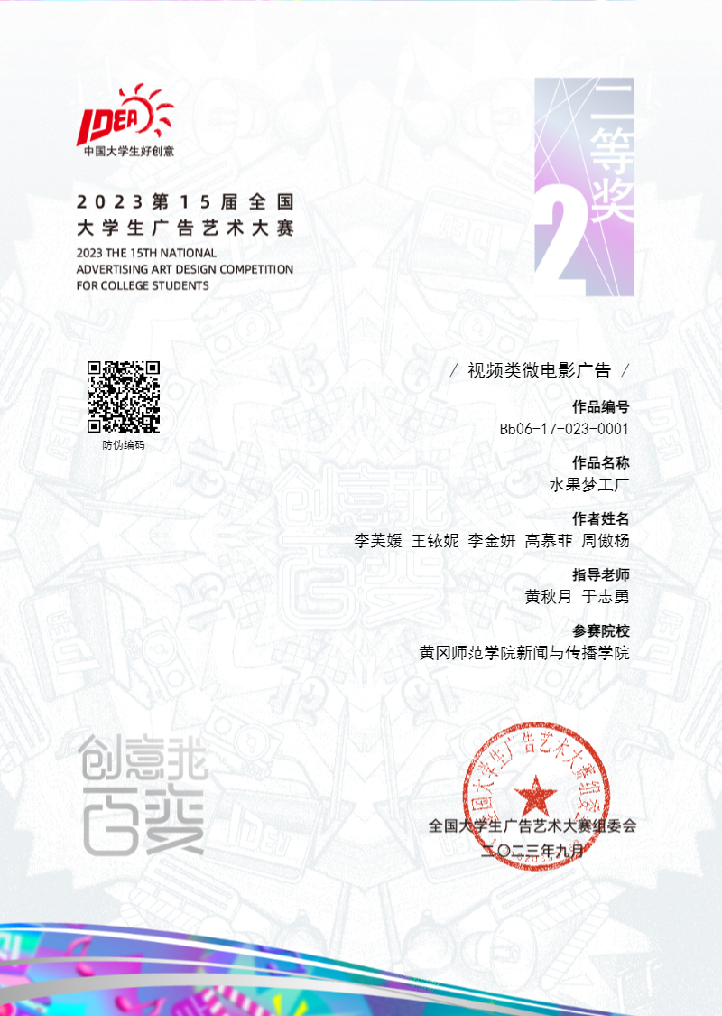 据悉,第15届大广赛共提交作品90余万件,公司编导2003班李芙媛主创的视频类电影广告《水果梦工厂》在此次大赛中脱颖而出,荣获全国二等奖。多年来公司高度重视此项赛事,安排专人负责大赛组织工作,充分发挥竞赛服务教学和人才培养的作用。