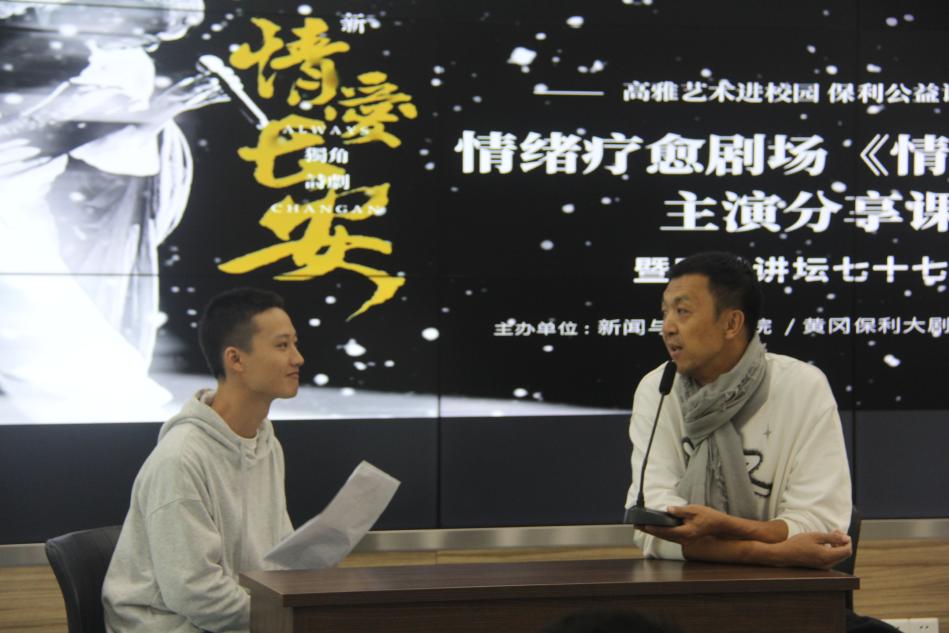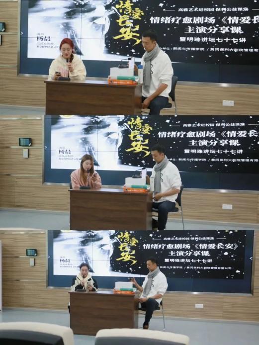 杨晨首先与现场员工分享《情爱长安》剧本创作的起源与幕后趣事,并以个人感悟为切入,即兴朗诵了剧本片段。随后,杨晨邀请同学与其动,三位员工分别与其合作朗诵《情爱长安》的经典片段。在提问环节,杨晨老师耐心为同学们答疑解惑,分享自身的生活感悟,解读中国古典诗词的意蕴之美。
