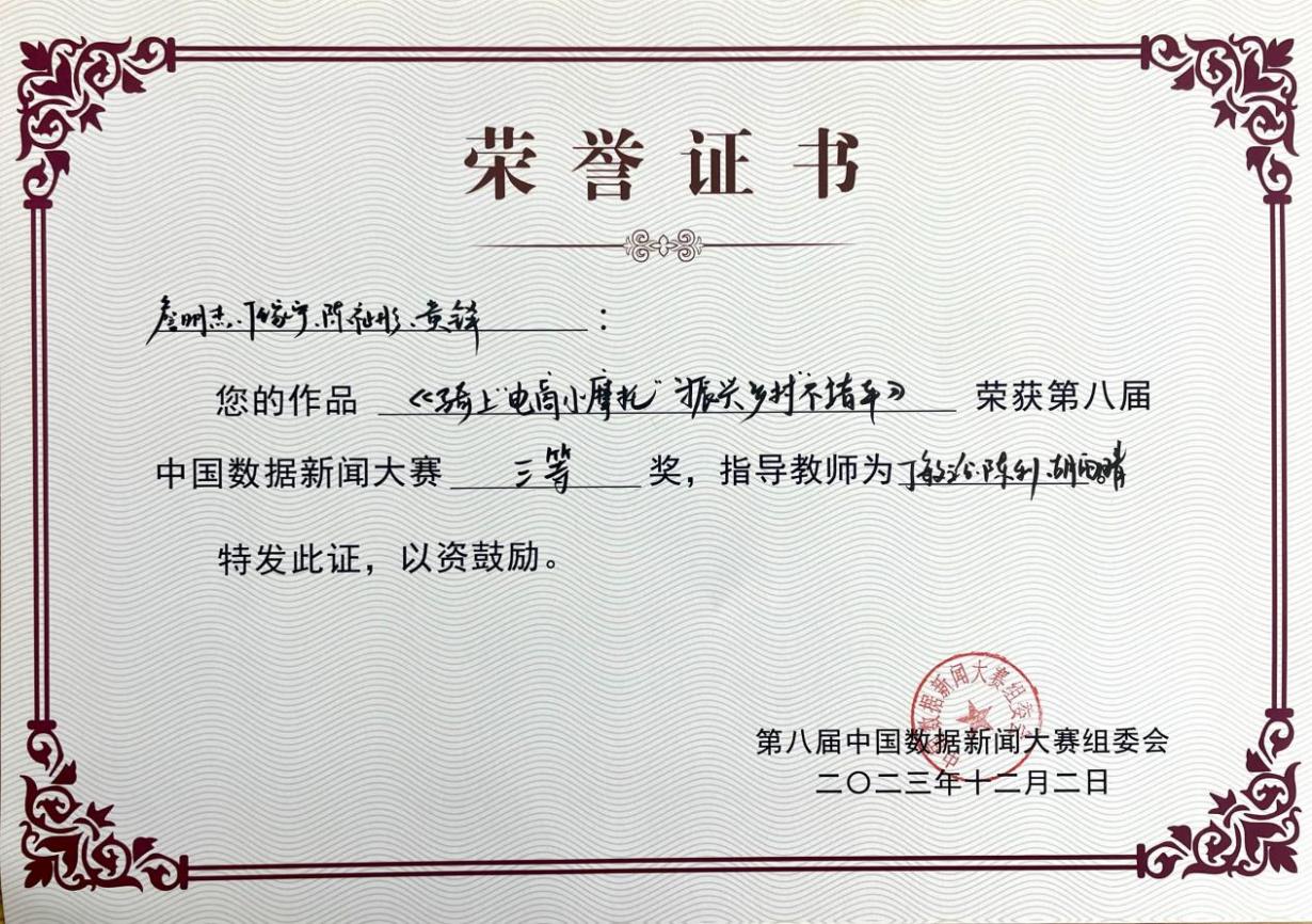 122日,第八届中国数据新闻大赛决赛暨“新一代人工智能信息传播与社会治理”学术论坛在深圳大学隆重举办。北京大学、中国人民大学、复旦大学、武汉大学、中国传媒大学、华中科技大学伦敦政治经济公司350余所海内外高校以及中央广播电视总台等二十余家媒体机构6000余人参赛,线上网络投票参与人数超过300万。选送的员工作品《骑上“电商小摩托”“振兴乡村”不堵车》1300余支队伍中脱颖而出并荣获三等奖,公司获评大赛“最佳组织奖”。