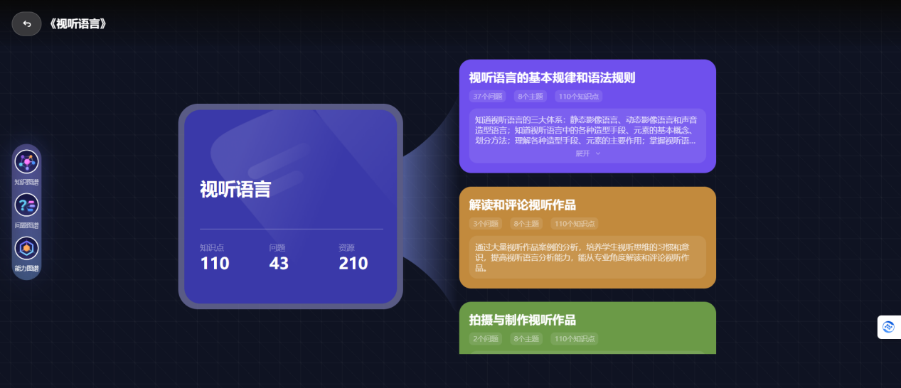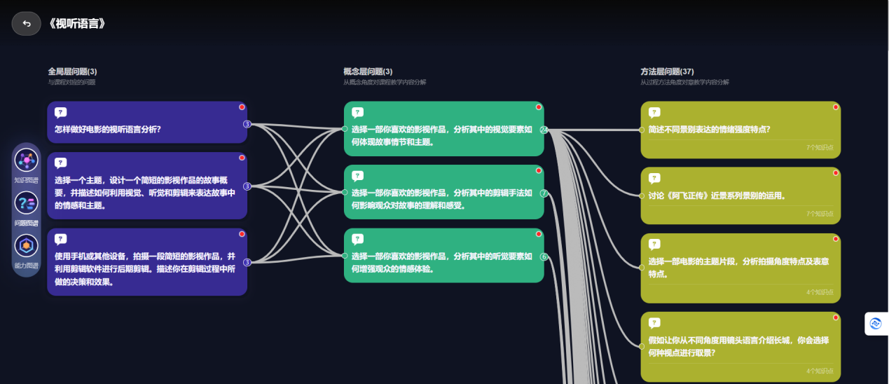 知识图谱扮演着教育数字化转型的核心角色。《视听语言》课程知识图谱已走在前列,借助AI智能赋能,依靠智慧树平台,不断加强课程的辐射广度和深度,提高教育管理和评价、员工学习与认知效能,今后为实现更加优质的教育提供强大动力。