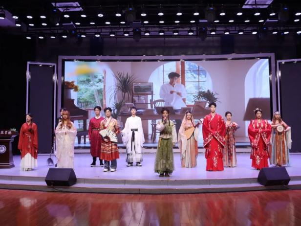 闭幕式中穿插同学们精心排演的节目。王昱文、彭子涵等带来的走秀作品《国风正当时》还原古人着衣与日常礼仪,展现了中华服饰文化和礼仪文化。张皇鑫带来的《天外来物》展现同学们能歌善舞多才多艺的一面。