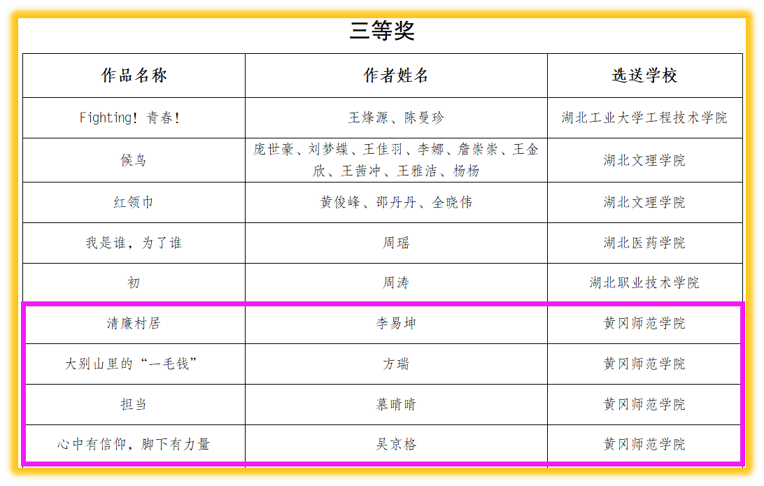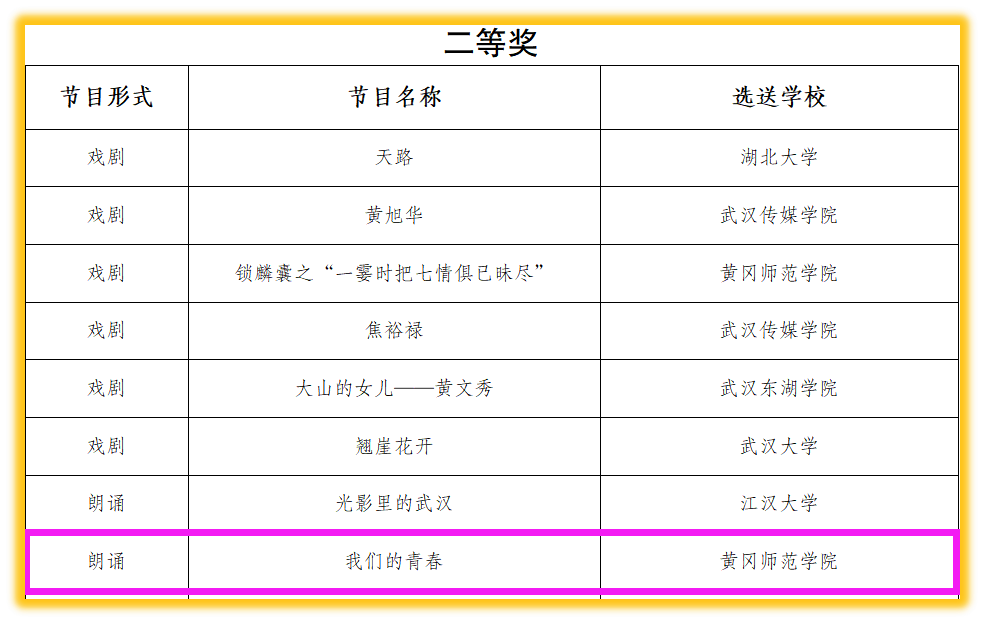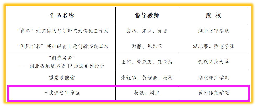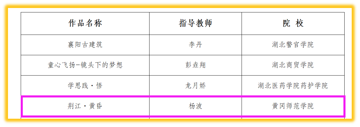 近日,湖北省教育厅公布第八届老员工艺术节“三优一案例”(优秀文艺节目、优秀美术作品、优秀艺术实践工作坊和高校美育改革创新案例)评选结果公示,我院选送的多项作品分别在艺术实践工作坊、美术作品、文艺节目三个赛道荣获一等奖2项、二等奖1项、三等奖4项,杨波、周卫2名教师获优秀指导教师奖。