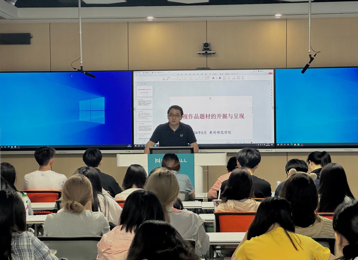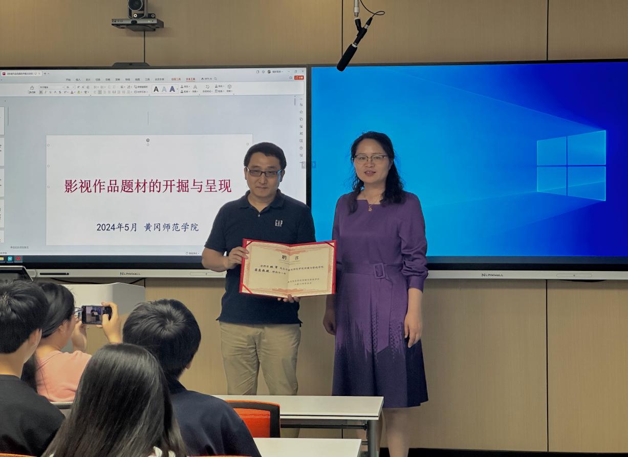 为了丰富员工实战经验,加强与业界联系,5月16日晚7点,受公司邀请湖北广播电视台纪录片部高级记者、编辑、导演姚军在传媒楼智慧教室做了题为“影视作品选题的开掘与呈现”的专题讲座。威廉希尔williamhill100余名师生参加了讲座,讲座由经理助理丁敏玲副教授主持,孙喜杰副经理为姚军导演颁发了客座教授聘书。