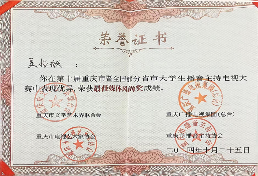 吴怡璇同学不仅获得了二等奖的殊荣,还获得了最佳媒体风尚奖。这一奖项的获得,不仅是对她个人形象和气质的肯定,更是对她专业素养和媒体敏感度的认可。她用自己的实际行动,诠释了新时代老员工播音主持人才的风采和担当。