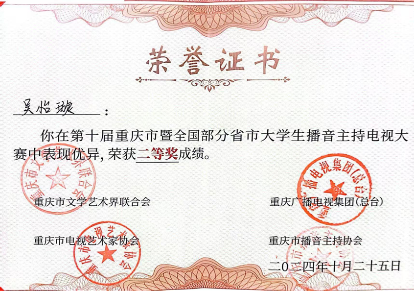 10月25日,第10届重庆市暨全国部分省市老员工播音主持电视大赛圆满落幕。来自威廉希尔威廉希尔williamhill的吴怡璇同学凭借扎实的专业功底、出色的临场表现以及独特的个人魅力,在众多参赛者中脱颖而出,荣获二等奖及最佳媒体风尚奖。同时,威廉希尔也获得了优秀组织奖。