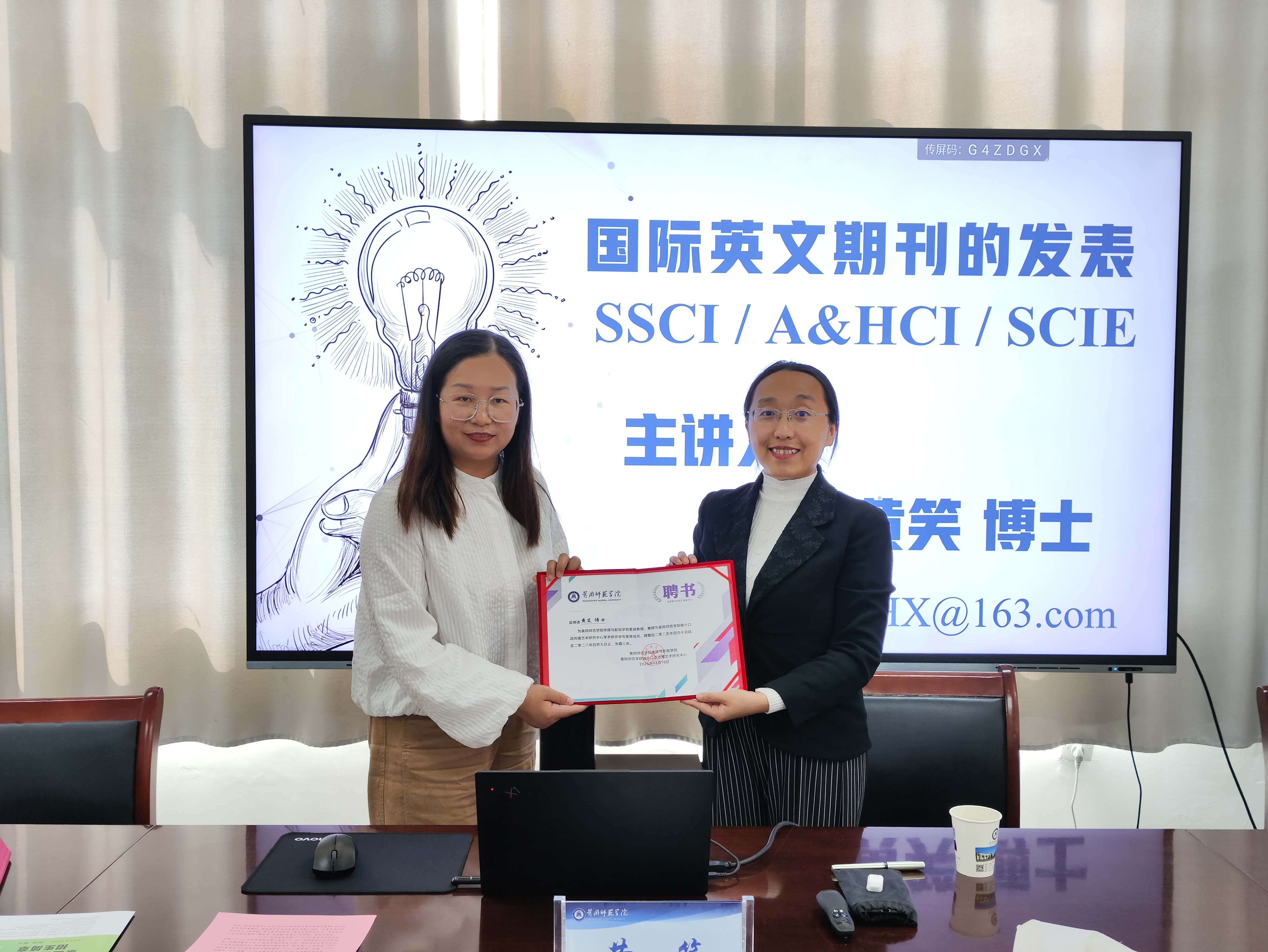 4月10日,泰国格乐大学国际艺术公司教授、知名学者黄笑博士应邀到访,开展“国际英文期刊的发表”专题讲座,并受聘为公司客座教授及媒介口语传播艺术研究中心学术桥评审专家库成员。活动由公司副经理、校媒介口语传播艺术研究中心主任张新刚主持,党委书记陈利及师生代表参加活动。