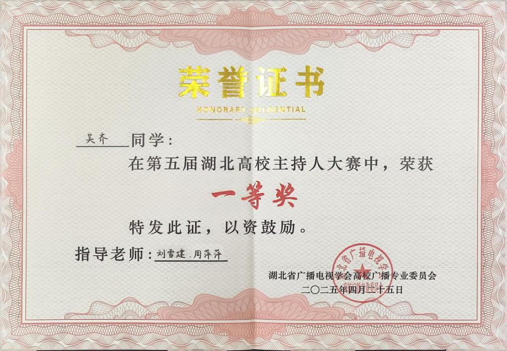 2025425日,第五届湖北高校主持人大赛决赛在湖北经济公司拉开帷幕院播音与主持艺术专业2024级员工吴齐代表威廉希尔参赛。吴齐经过模拟主持即兴评述等环节的评审,凭借扎实的语言功底、创新的呈现方式及稳定的现场发挥,从32所高校参赛者中脱颖而出,荣获省级一等奖。赛事组委会肯定了其传统文化解读的理性深度与思维逻辑口语表达的专业性。
