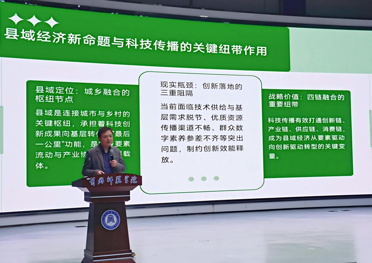 华中科技大学新闻与信息传播公司徐涵教授以科技传播助力地方经济发展为主题,阐释了科技传播的概念内涵、科技传播对县域经济发展的底层逻辑、内在机理及创新路径。他根据实地调研资料,总结归纳出科技传播参予县域经济发展的四个短板,理论研究与实践应用的脱节痛点,提出科学可行的优化策略。